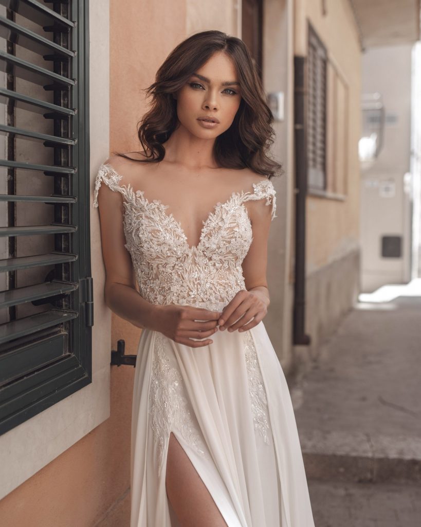 Wspaniała, letnia sukienka ślubna pełna lekkości i swobody. Górę sukni tworzy przeźroczysta siateczka z ozdobnymi cekinami i drobnymi, przestrzennymi aplikacjami. Całość gorsetu osadzona została na transparentnej tkaninie, która wręcz wtapia się w kolor skóry tworząc magiczny efekt iluzji. Z przodu suknia uwodzi dwoma rozcięciami z ozdobną, dekoracyjną podszewką. Asymetryczne rozporki na spódnicy sprawiają, że sukienka […]